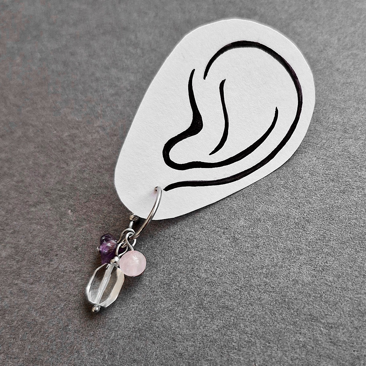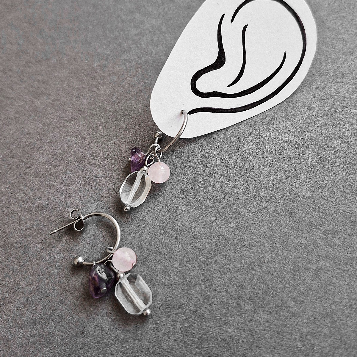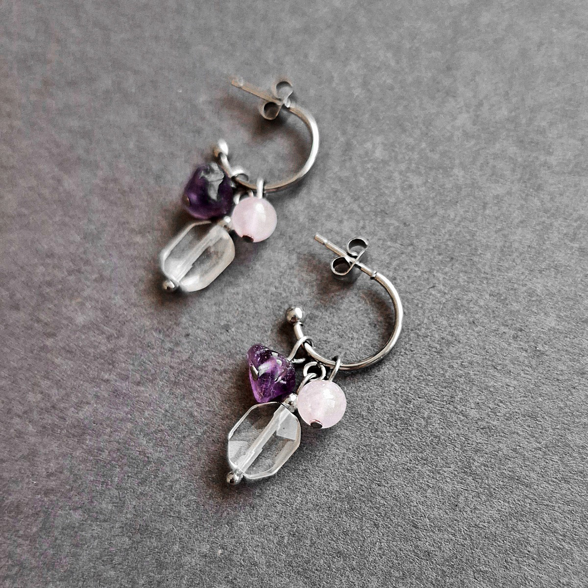 Edelstahl-Halbcreole, Bergkristall, Amethyst, Rosenquarz, Metallelemente aus Edelstahl