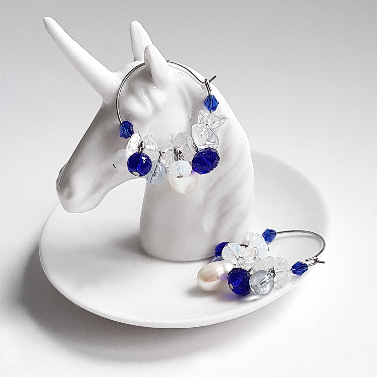 Außergewöhnlicher Unikat Ohrschmuck aus Edelstahl mit weißem Achat und Glasperlen. Eine extra Prise Hippie-Chic in Form edler Creolen mit funkelnden Perlen!