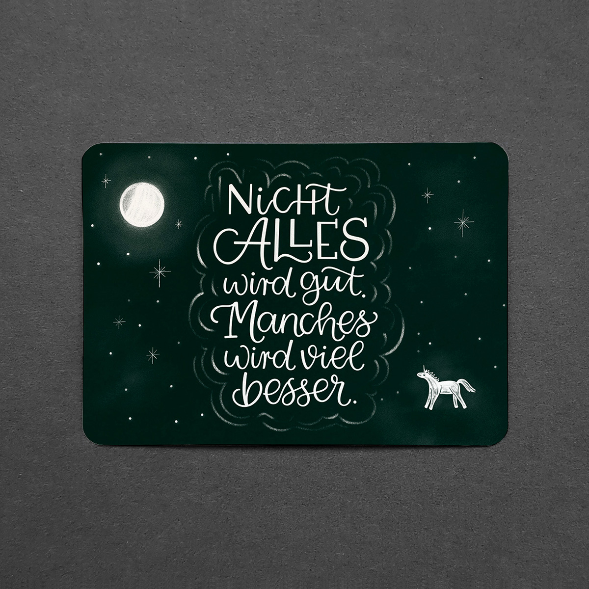 Verspielte und witzige Postkarte mit abgerundeten Ecken. Kontrastreiches Design mit Illustration und Schrift.