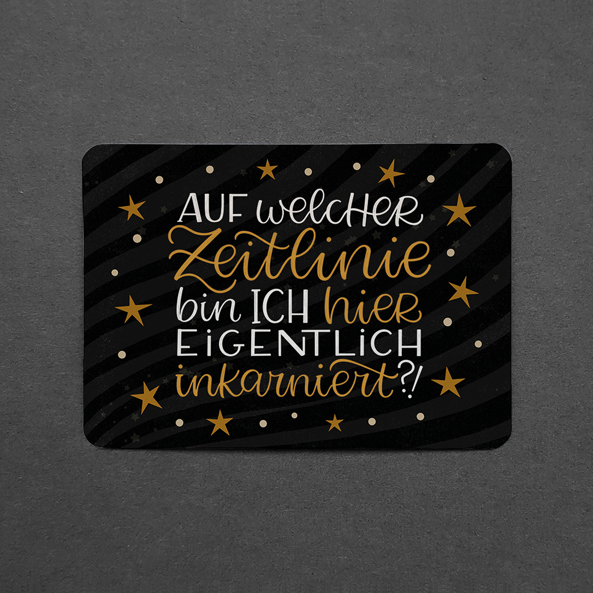Verspielte und witzige Postkarte mit abgerundeten Ecken. Kontrastreiches Design mit Illustration und Schrift.